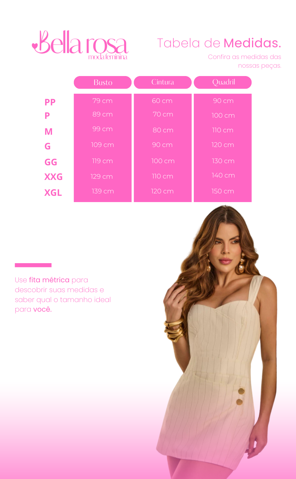 MEDIDAS DA MODELO: Altura 1.63 cm, Busto 89 cm, Cintura 70 cm, Quadril 99 cm, Modelo Veste Tamanho: P